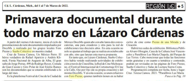 Muy contentos de compartir que FORO PIEZAS sigue creando alianzas. Esta ocasión es con Sueño Colectivo al mando de Jesús Baldovinos, quien ha sido promotor de la Primavera Documental, un programa especial del Festival DocsMx que girará por la ciudad de Lázaro Cárdenas.